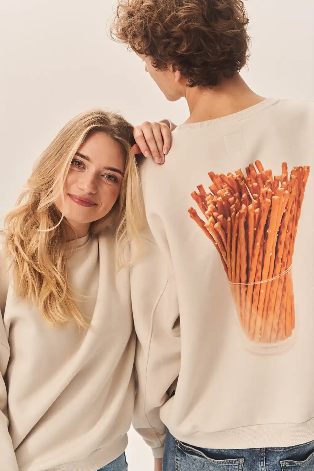 Paluszki, klasyk każdego spotkania towarzyskiego, wylądowały na mięsistej, beżowej bluzie, w kroju odpowiednim dla każdej płci i wielu różnych sylwetek. Od frontu klasyczny, beżowy gładzioch, na plecach duży paluszkowy druk. W środku wykończona miziastym, milutkim misiem.