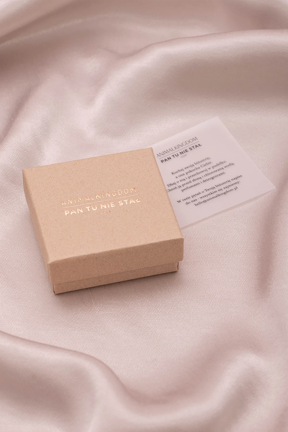 - Biżuteria pakowana jest w tekturowe pudełeczko z tłoczonym miedzianym logo ANIMALKINGDOM i PTNS