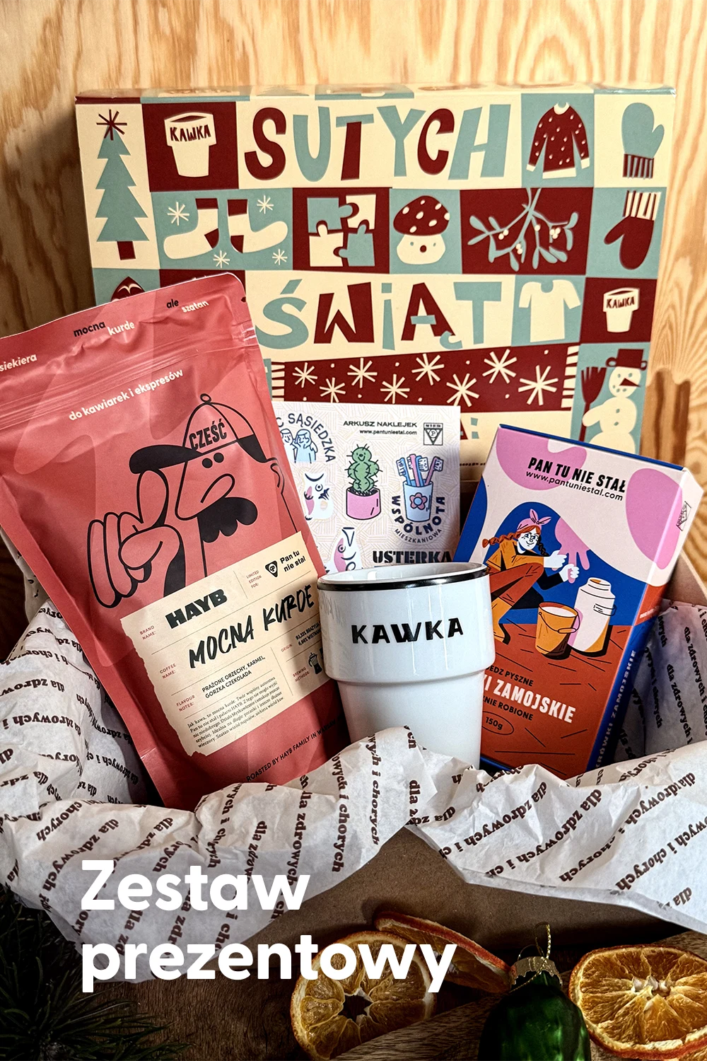Oto gotowiec prezentowy dla każdej osoby pijącej kawę. Przede wszystkim Mocna Kurde - działa błyskawicznie i smakuje jeszcze szybciej. Idealna na długie poranki i jeszcze dłuższe wieczory. Szatan wśród napojów, siekiera wśród kaw. Działanie wzmacnia odpowiedni kubek, a smak doskonale uzuepłniają tradycyjne krówki zamojskie. A do tego 13 naklejek dla wszystkich domatorów, domatorek i osób mieszkających w mieszkaniu. Całość zapakowana w estetyczne, świąteczne pudełko. Czego chcieć więcej?